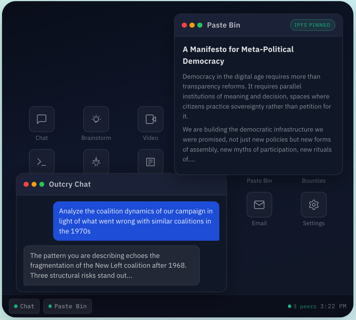 OutcryOS is one attempt at an Activist Operating System. There should be others. The need is too large and too urgent for any single project to answer. But the premise is simple: organizers deserve an operating system built for the actual conditions of their work. An operating system. Encrypted at rest. Networked peer-to-peer. Intelligent by default. And under the control of the people who use it.