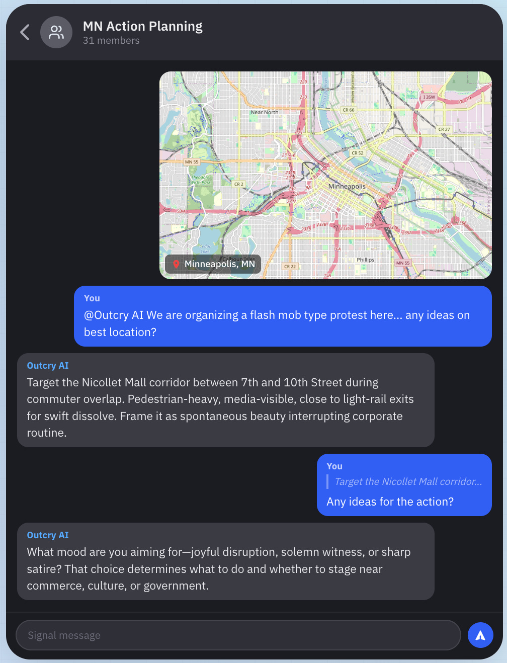 Picture a group thread: thirty-one members planning a direct action. Someone asks for location ideas. Outcry analyzes foot traffic, media visibility, transit proximity for dispersal. Someone else asks about tone—joyful disruption or solemn witness? Outcry maps how that choice reshapes staging, site selection, public reception. The thread moves. Decisions crystallize. No one scheduled a meeting.